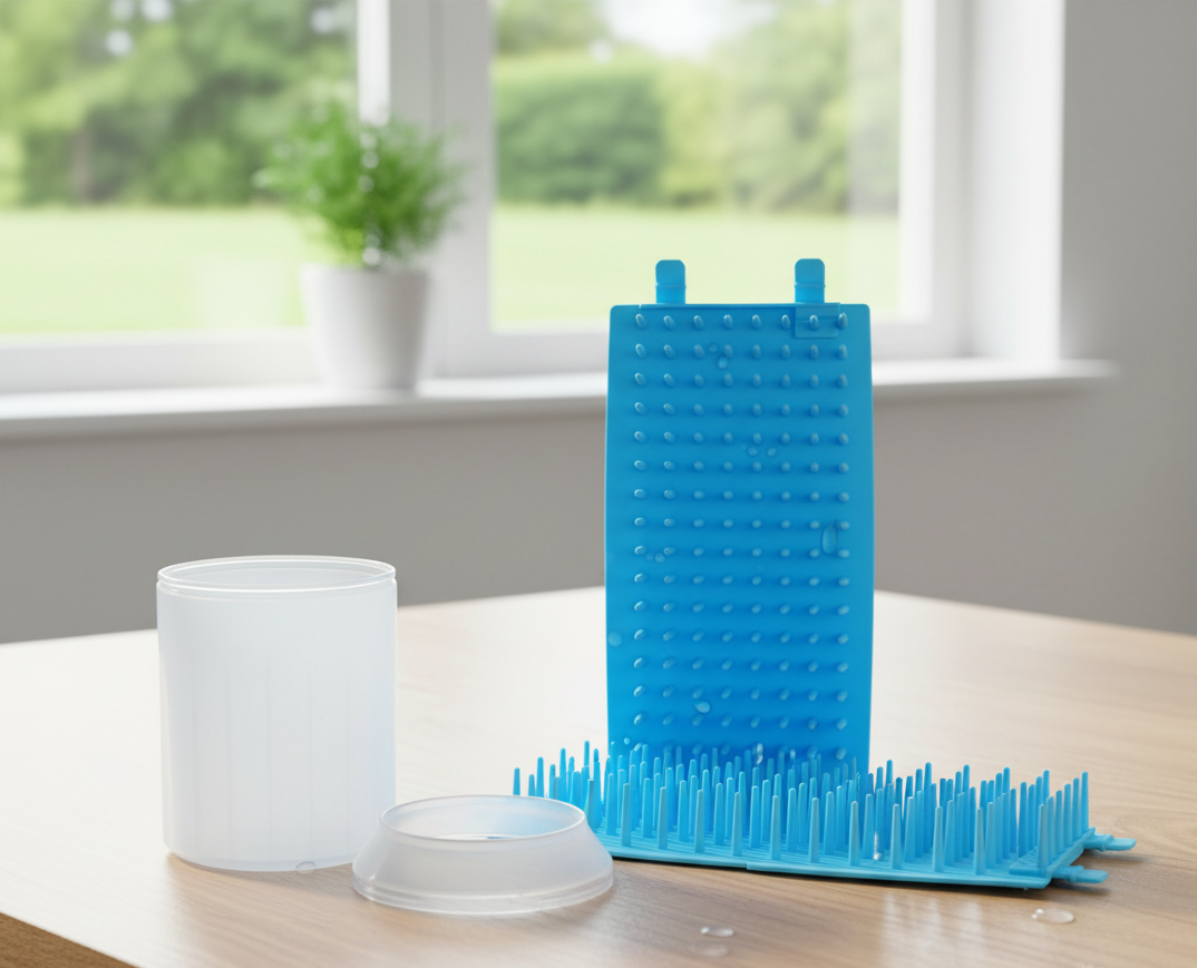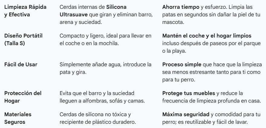 👉 Solo añade un poco de agua, mete la patita y gira suavemente. Sus cerdas de silicona ultrasuaves eliminan la suciedad en segundos, sin hacer daño a tu perro. ¡Rápido, cómodo y sin ensuciar tu casa ni tu coche!