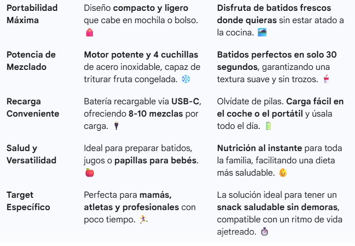 👉 Su potente motor y 4 cuchillas de acero inoxidable mezcla frutas, verduras, nueces ¡incluso congeladas! en apenas 30 segundos. Compacta y ligera, cabe en tu mochila o bolso para que nunca te falte energía saludable.